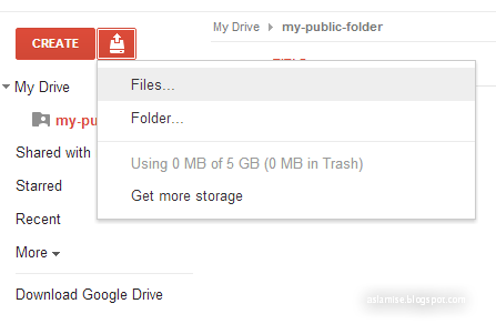 8 Click on the drive icon next to the 'CREATE' . then select file if you want upload just a test file. Or a folder to upload a set of files inside a folder. Here i upload just a single file named index.html So i click on file - then select index.html